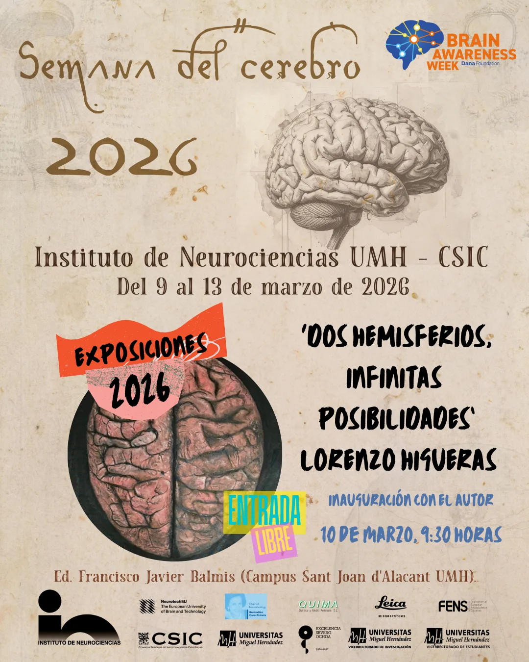 Con motivo de la Semana del Cerebro 2026, la Universidad Miguel Hernández (UMH) acoge la presentación de la obra “Dos hemisferios, infinitas posibilidades”, creada por el artista Lorenzo Higueras, becario de la Asociación de Pintores con la Boca y con el Pie.