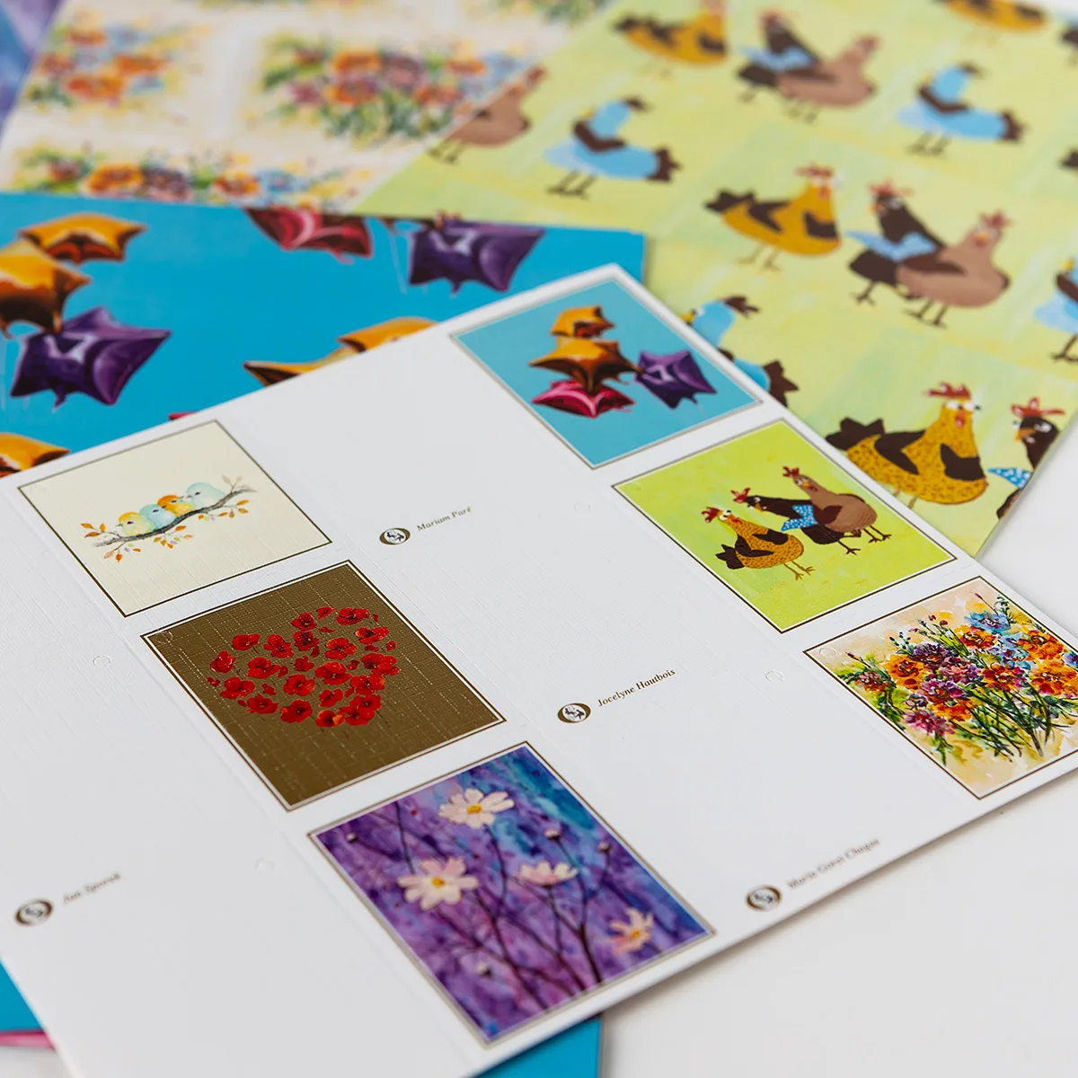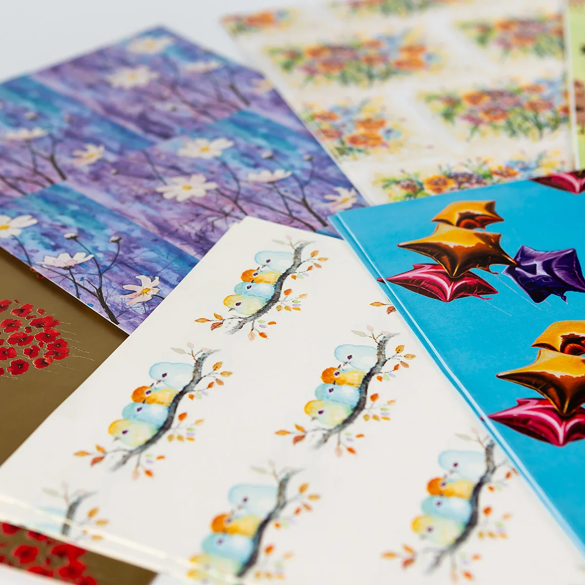 12 pliegos con reproducciones de gran calidad y atractivos diseños primaverales. Viene acompañado de sus correspondientes tarjetas de regalo.